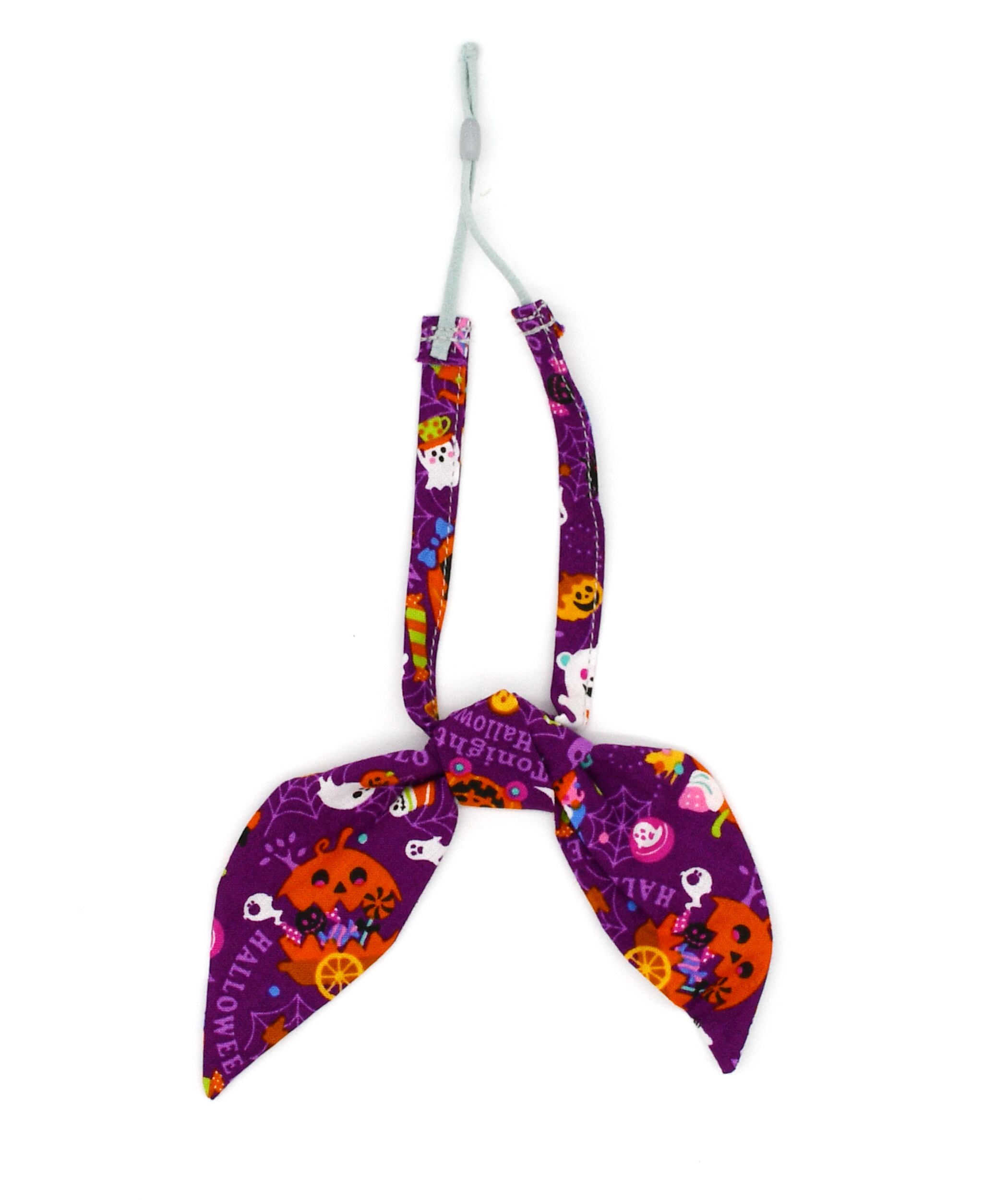 大かぼちゃ柄の結びバンダナタイプのアクセサリー。色はオレンジとパープルの2色展開。首元のワンポイントおしゃれにピッタリのワンコ用バンダナです。