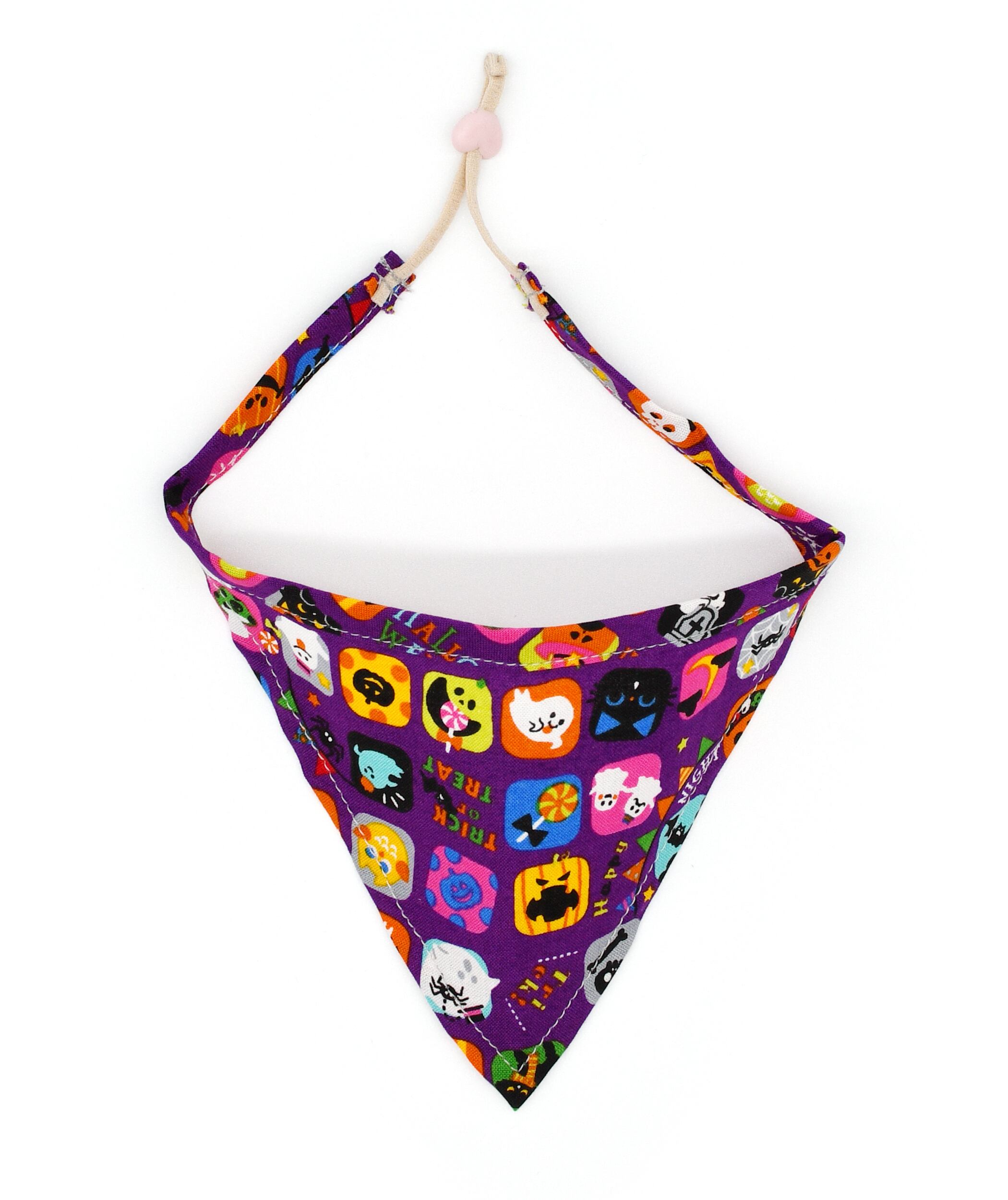 ハロウィン柄の三角巾バンダナタイプのアクセサリー。色はオレンジとパープルの2色展開。首元のワンポイントおしゃれにピッタリのワンコ用バンダナです。