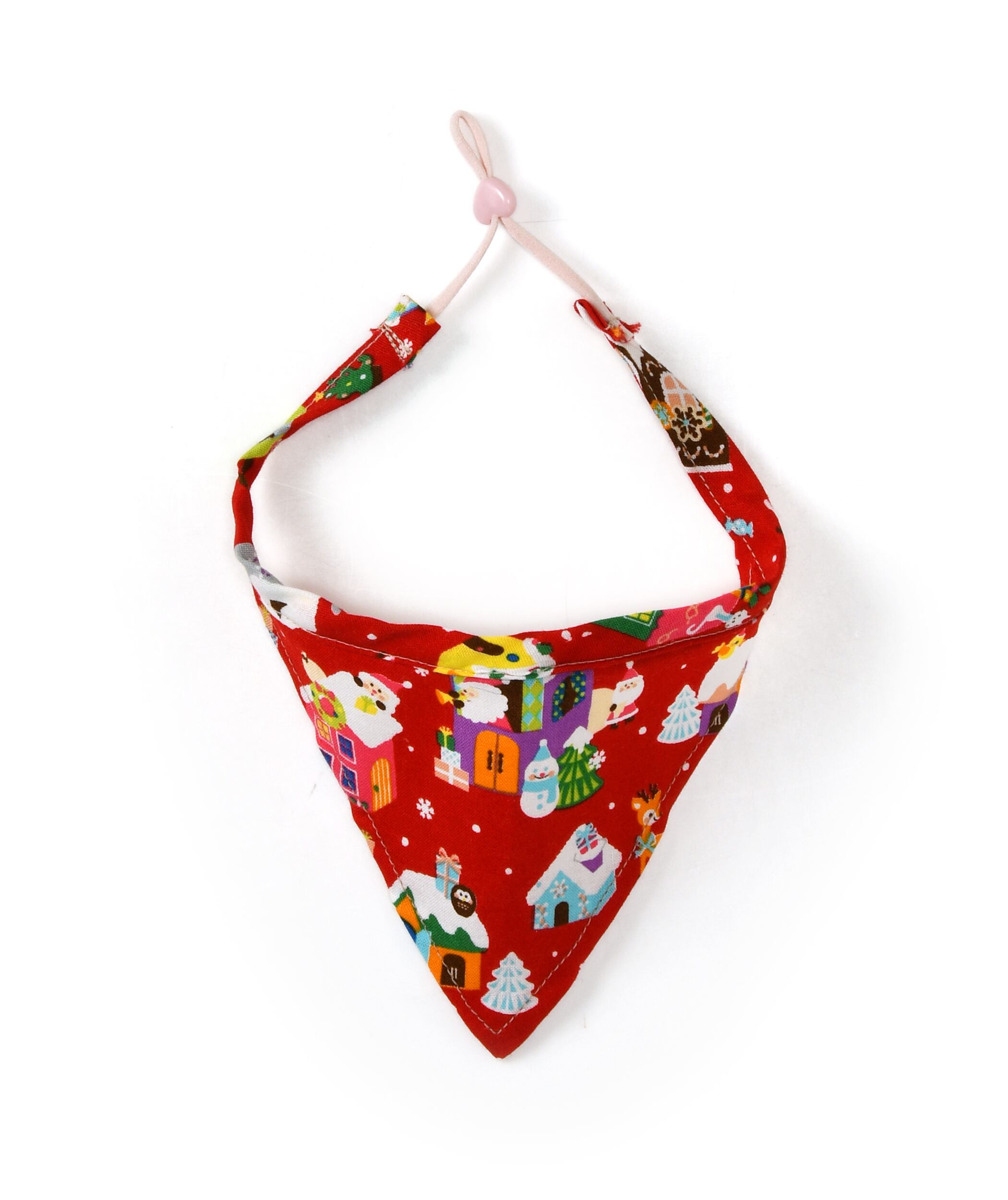 サンタ柄の三角巾バンダナタイプのアクセサリー。色はレッドとブラックの2色展開。首元のワンポイントおしゃれにピッタリのワンコ用バンダナです。